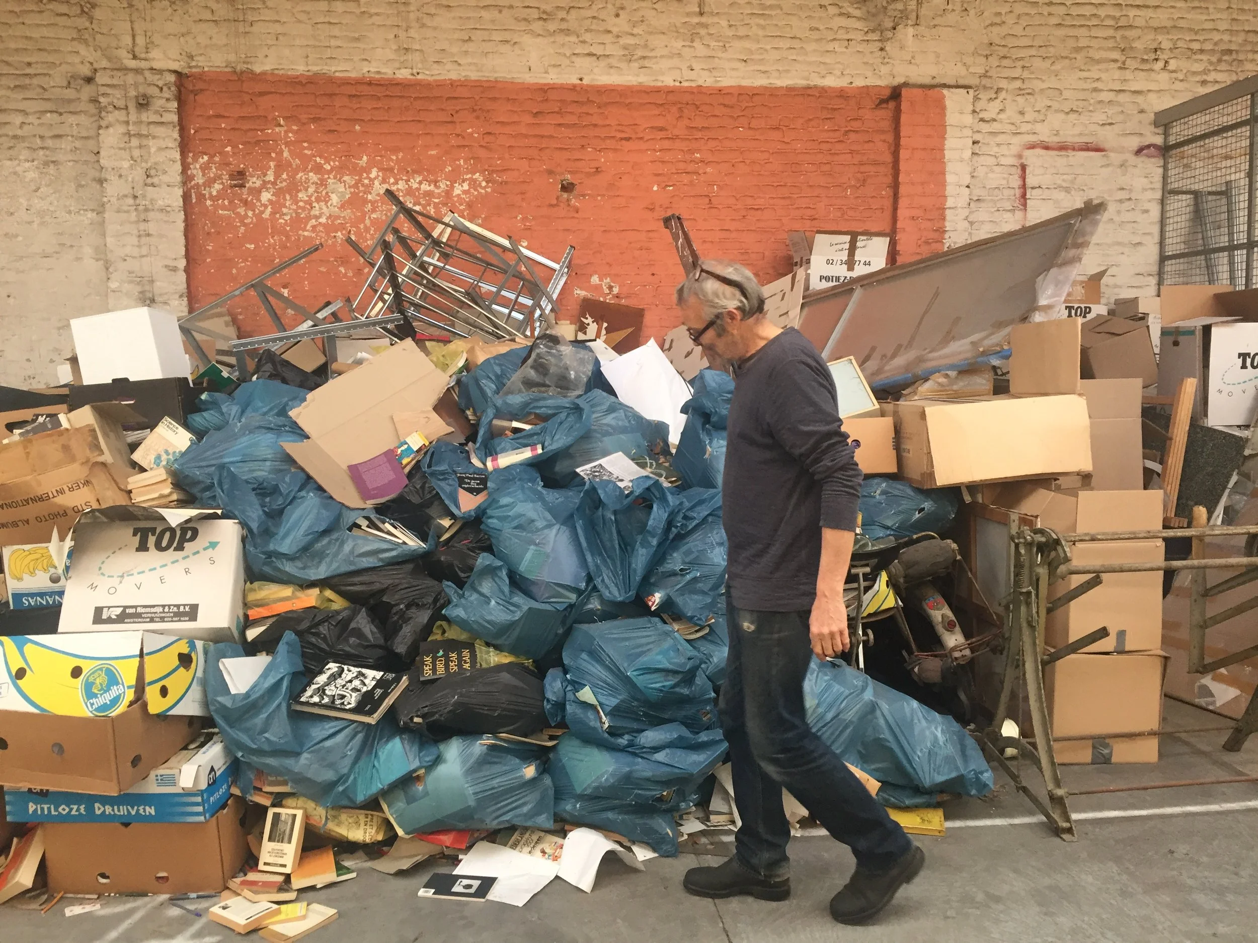Foto van Jan Vancaillie bij de toestand van het archief bij de Brusselse vuilophaaldienst, 2019. Fotograaf Dorothée van den Berghe.