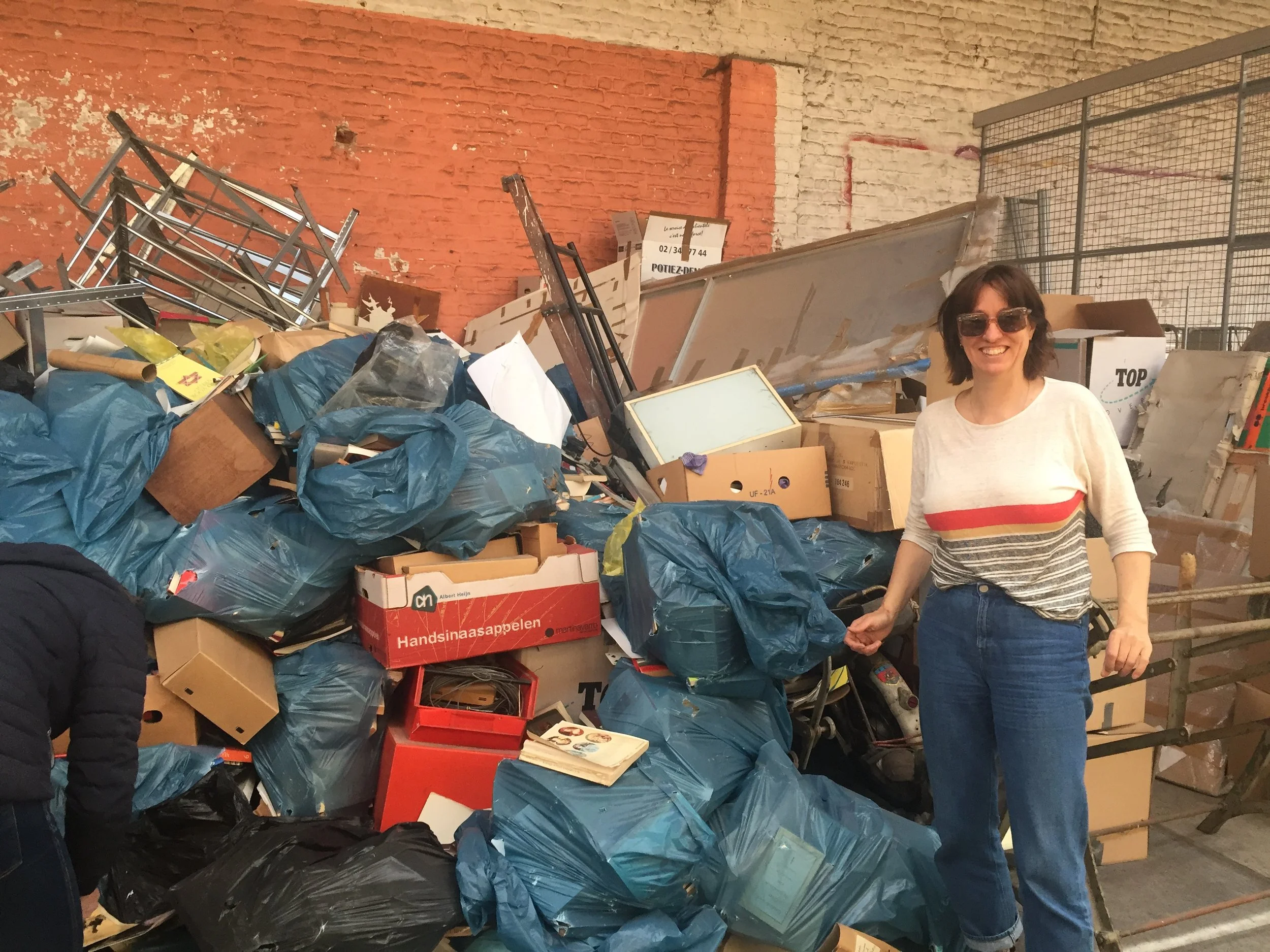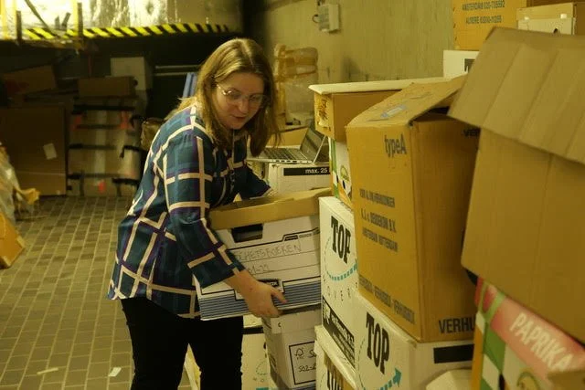 Foto van Dorothée van den Berghe bij de toestand van het archief bij de Brusselse vuilophaaldienst, 2019. Fotograaf Jan Vancaillie.