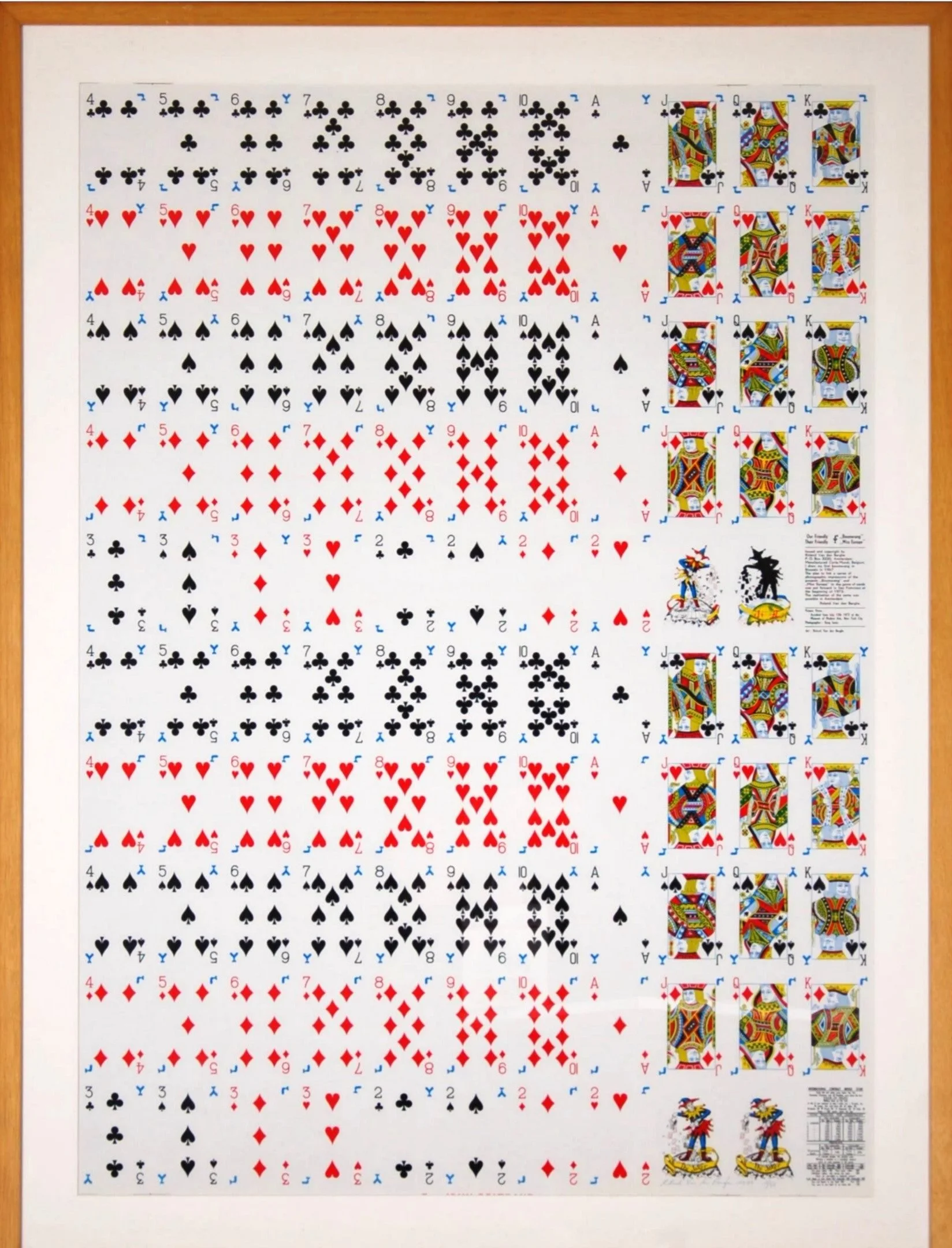 De eerste oplage (5000) werd zeer mooi gedrukt door Carta Mundi, in Turnhout. Tweehonderd onversneden bladen - waarop dus recto het hele kaartspel in één oogopslag te zien is en verso al de foto's - worden genummerd en gesigneerd verkocht. Zij lopen als een trein. Verzamelaars vinden het origineel en esthetisch. Van den Berghe realiseert zich heel goed dat hij hiermee meteen in het commercieel-artistieke circuit zit, dat hij haat en bestrijdt. "Maar ik moest wel een handzame vorm vinden om vlotter te kunnen communiceren. Tot nu toe maakte ik meestal dingen, deed ik dingen die onverkoopbaar waren, of uniek. Die dus weinig mensen bereikten. Maar wat is handiger dan een spel kaarten, is speelser? En hierin heb ik dus nu een aantal ideeën en gevoelens geconcentreerd die ik mee te delen heb, en die ik tevoren slechts afzonderlijk kwijt kon."